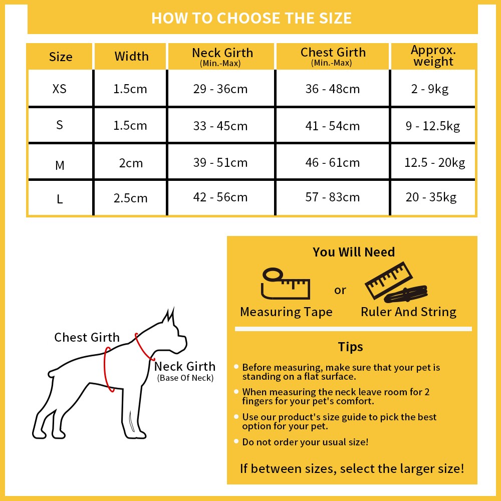 Caution: For use only on dogs. Not for tie-out. Sizing should allow room for 2 fingers to fit between the item and the dog.