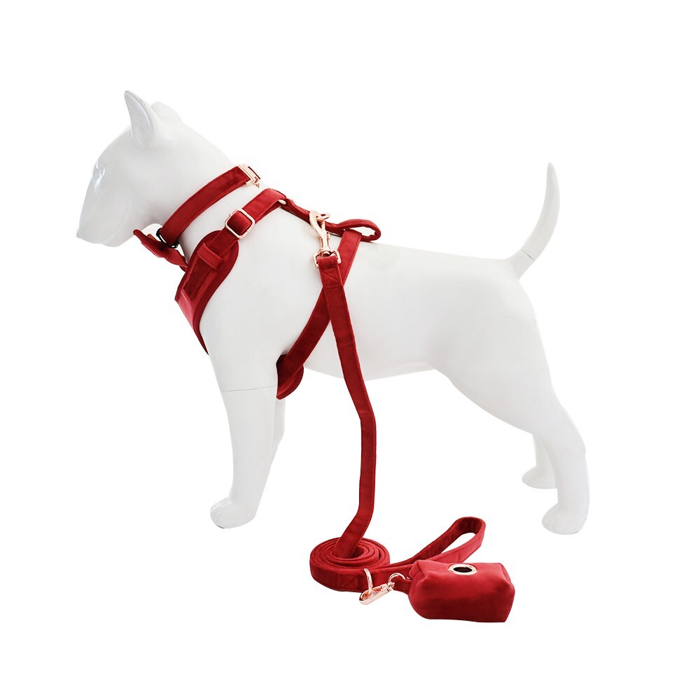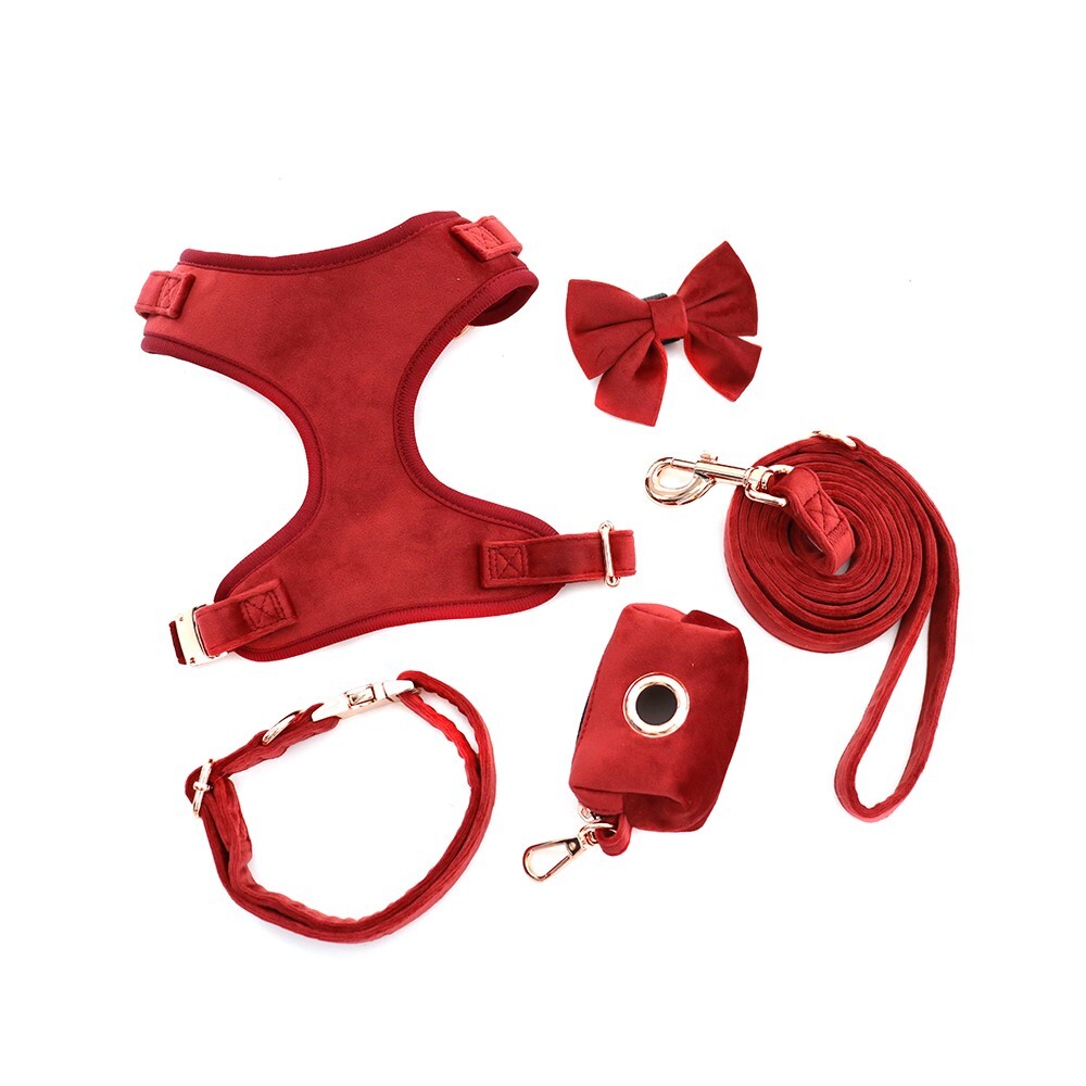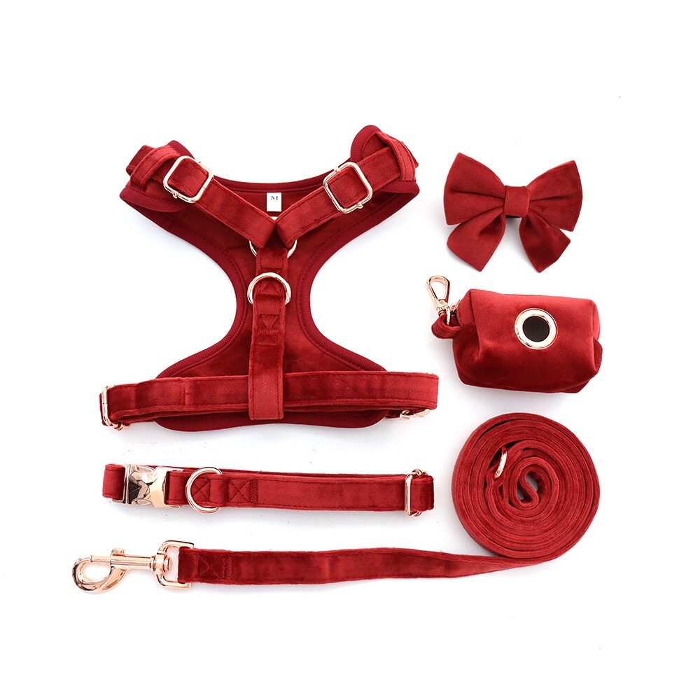 Today we would like to introduce you to our best-hot selling product:Bordeaux red harness set.The whole body is made of velvet fabric, which feels soft and smooth. The color scheme is a classic Bordeaux red, which reminds me of a glass of red wine and is so elegant and charming. In addition, we boldly designed the rose gold metal buckle to match, such embellishments make the whole look more detailed, but also add a little vitality!