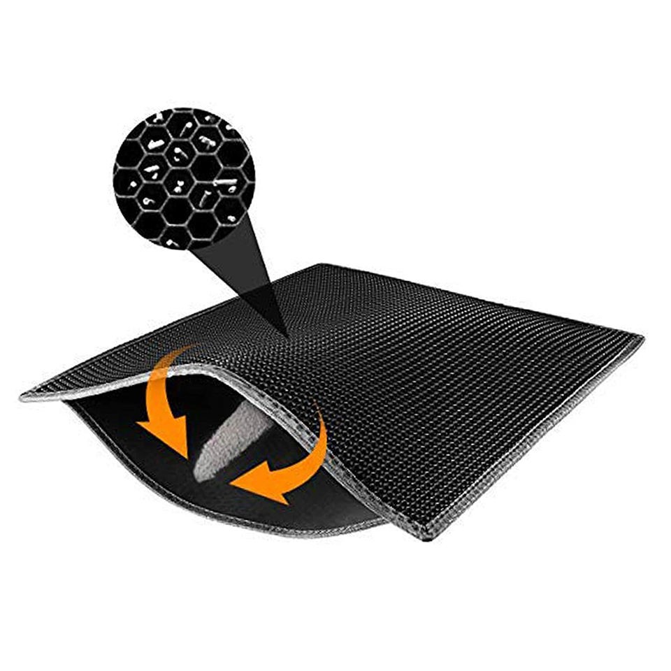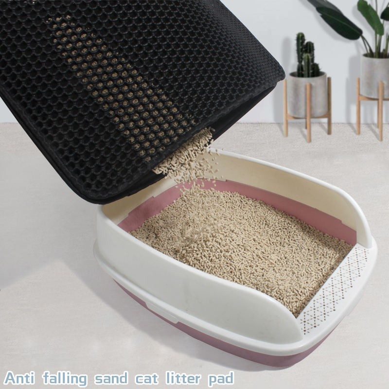 Double-layer honeycomb litter trapper mat design helps you gather the litter. You just need to pick up the litter box mat and all the litter falls through. And then dump it back in the litter box for reuse.